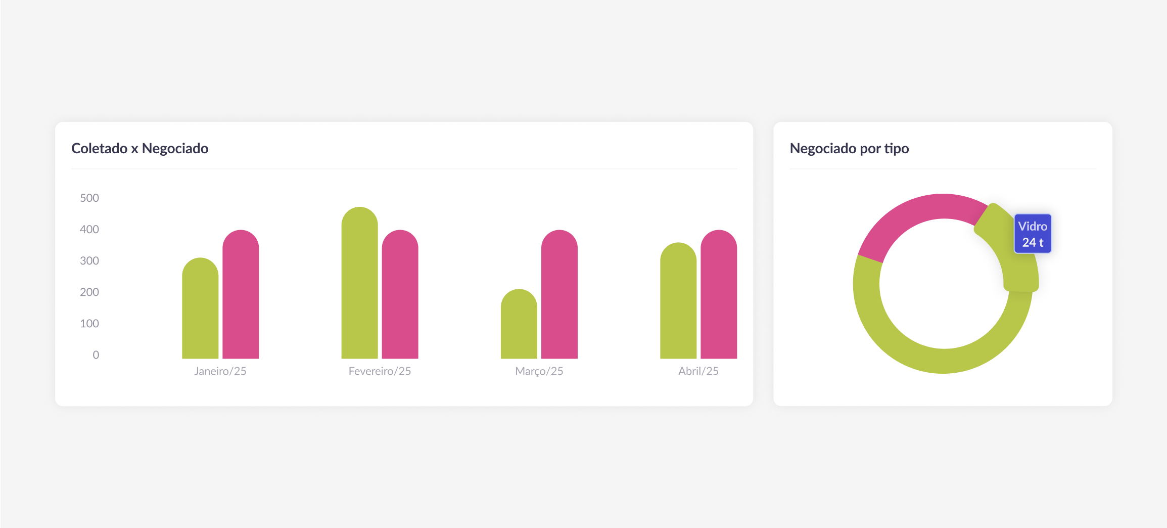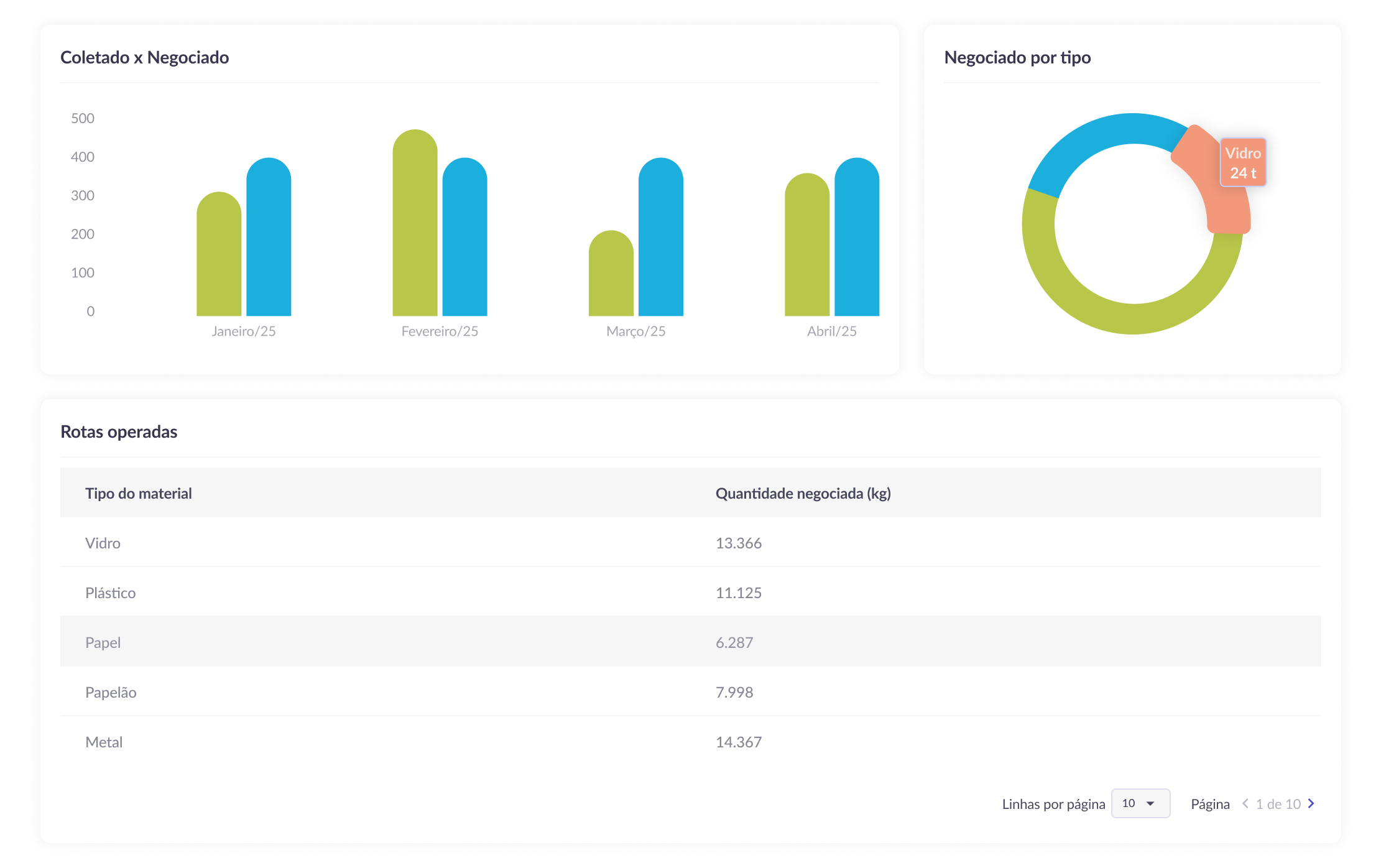 Controle o volume total coletado e negociado de cada tipo de material reciclável com relatórios de fácil entendimento